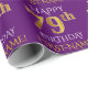 Este design de papel de embrulho apresenta uma mensagem como "FELIZ 79º ANIVERSÁRIO", com o "79º" a ter uma aparência falsa/imitação de ouro. Ele também apresenta um nome personalizado e um fundo de cor roxa. Talvez possa ser utilizado quando se dá presentes para o setenta e nono aniversário de alguém. [~Z0000134]