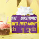 Este design de papel de embrulho apresenta uma mensagem como "PRIMEIRO NOME DO 13 DE ANIVERSÁRIO!", com o "13" a ter uma aparência falsa/imitada de cor dourada, e com o nome e "ANIVERSÁRIO" numa letra divertida e ousada. O nome pode ser personalizado, e o fundo é roxo colorido. Um papel embrulhante como este poderia talvez ser usado no empacotamento de presentes de aniversário que são dados a alguém em comemoração do seu décimo terceiro aniversário. [~Z0000206]