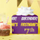 Este design de papel de empacotamento apresenta uma mensagem como "PRIMEIRO-ANIVERSÁRIO!", com o "7" a ter uma aparência falsa/imitada de cor dourada, e com o nome e "ANIVERSÁRIO" numa letra divertida e ousada. O nome é personalizável e o fundo é roxo colorido. Um papel de embrulho como este poderia talvez ser usado no embrulho de presentes de aniversário que são dados a alguém em comemoração do seu sétimo aniversário. [~Z0000206]
