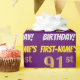 Este design de papel de embrulho apresenta uma mensagem como "PRIMEIRO NOME'S 91rua BIRTHDAY!", com a "91ruas" a ter uma aparência falsa/imitada de cor dourada, e com o nome e "BIRTHDAY" numa letra divertida e ousada. O nome é personalizável e o fundo é roxo colorido. Um papel de embrulho como este poderia talvez ser usado no embrulho de presentes de aniversário que estão sendo dados a alguém em comemoração de seus 90 anos de primeiro aniversário. [~Z0000206]