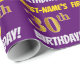 Este design de papel de embrulho apresenta uma mensagem como "aniversário de 30 anos do NOME PRIMEIRO!", com o "30" a ter uma aparência falsa/imitada de cor dourada, e com o nome e o "BIRTHDAY" numa fonte divertida e ousada. O nome pode ser personalizado, e o fundo é roxo colorido. Um papel de embrulho como este poderia talvez ser usado para embrulhar presentes de aniversário que são dados a alguém em comemoração do seu trigésimo aniversário. [~Z0000206]