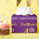 Este design de papel de embrulho apresenta uma mensagem como "Aniversário de 4 anos do PrimeiroNome!", com o "4º" tendo uma aparência de cor dourada falsa/imitação. O nome pode ser personalizado e o fundo é roxo. Poderia ser usado, por exemplo, ao embrulhar presentes dados para o quarto aniversário de alguém.