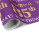 Este design de papel de embrulho apresenta uma mensagem como "FirstName’s 85th BIRTHDAY!", com o "85º" a ter uma aparência falsa/de cor dourada. O nome pode ser personalizado, e o fundo é roxo colorido. Talvez possa ser utilizado quando se dá presentes para o oitenta quinto aniversário de alguém. [~Z0000182]