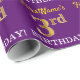 Este design de papel de embrulho apresenta uma mensagem como "aniversário de 3 anos do PrimeiroNome!", com o "3º" com uma aparência de cor falsa/imitada em ouro. O nome pode ser personalizado, e o fundo é roxo colorido. Talvez possa ser utilizada quando se trata de dar presentes para o terceiro aniversário de alguém. [~Z0000182]