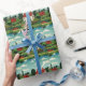 A small pond or lake with swimming ducks, and a setting of green trees and shrubs.