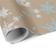 Um papel de embrulho cor kraft brilhante, com flocos de neve grandes e pequenos a cair, em tons azuis prateados e verdes, com flocos de neve prateados.