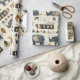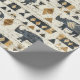 Bold tribal rhino pattern wrapping paper featuring distressed black rhinoceros silhouettes paired with geometric mudcloth-style motifs in warm tan and charcoal on a textured beige background. A rugged, earthy design ideal for safari enthusiasts, boho decor lovers, and wildlife-inspired style fans.