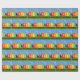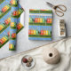 Quatro sacos de compras coloridos soletrando 'SALE' (liquidação) pendem de um varal, contrastando lindamente com a paisagem natural atrás deles