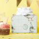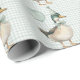 Este papel de embrulho inspirado retroativamente apresenta um adorável pato vestido com um chapéu de festa e gravata de arco, segurando um balão branco. O fundo suave de gingham verde-sábio adiciona um olhar confortável e rústico.