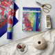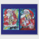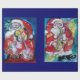 Pintura colorida, branca e artística em acrílico, Papais noeis estão tocando violino na noite de inverno nevada, coruja, ornamentos florais, plantas de inverno, bagas holly em cores vermelho vivo, verde, branco, azul, amarelo. por Búlgaro Lumini (c)