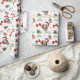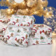 The repeated pattern on this Christmas wrapping paper includes an image of a Brittany Dog wearing a red and white Santa Claus hat. Also included in the pattern is a gingerbread man, a red bow, a holly sprig with red berries, and varied sizes of ornate gold snowflakes. Stylized red and green text says MERRY CHRISTMAS" and "HAPPY NEW YEAR". Be sure to see the matching gift tags in our store.