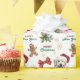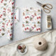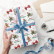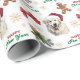 The repeated pattern on this Christmas wrapping paper includes an image of a beautiful Great Pyrenees dog wearing a red and white Santa Claus hat. Also included in the pattern is a gingerbread man, a red bow, a holly sprig with red berries, and varied sizes of ornate gold snowflakes. Stylized red and green text says MERRY CHRISTMAS" and "HAPPY NEW YEAR". Be sure to see the matching gift tags in our store.