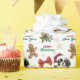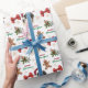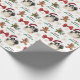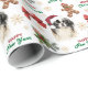 The repeated pattern on this Christmas wrapping paper includes an image of an adorable Japanese Chin dog wearing a red and white Santa Claus hat. Also included in the pattern is a gingerbread man, a red bow, a holly sprig with red berries, and varied sizes of ornate gold snowflakes. Stylized red and green text says MERRY CHRISTMAS" and "HAPPY NEW YEAR". Be sure to see the matching gift tags in our store.
