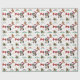 The repeated pattern on this Christmas wrapping paper includes an image of a Greater Swiss Mountain Dog wearing a red and white Santa Claus hat. Also included in the pattern is a gingerbread man, a red bow, a holly sprig with red berries, and varied sizes of ornate gold snowflakes. Stylized red and green text says MERRY CHRISTMAS" and "HAPPY NEW YEAR". Be sure to see the matching gift tags in our store.