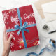 Modern, cute, elegant personalized Christmas gift wrap for kids, with a unicorn (with a red-and-golden mane and tale) pulling Santa's sleigh; the greeting "Merry Christmas" in stylish typography; and a personalized name. On a Xmas red background, with many cute, festive snowflakes.