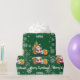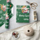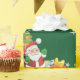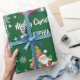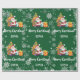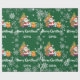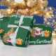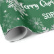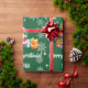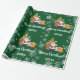 Modern, cute, festive custom-made Christmas gift wrap for kids, with Santa, a Christmas tree, lots of presents, the greeting "Merry Christmas" in stylish typography, and a personalized name. On a Xmas green background, with snowflakes.