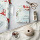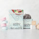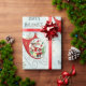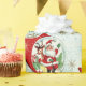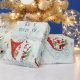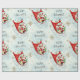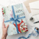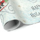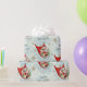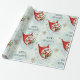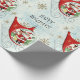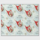 This pattern features a charming, vintage-style holiday design on a light, speckled blue and white background dotted with gold snowflakes. The central motif is a red helicopter shaped like a sleigh, with a clear cabin inside that showcases a classic depiction of Santa Claus waving alongside a reindeer. The words "HAPPY HOLIDAYS" are printed across the pattern in a dark, slightly distressed script, creating a repeating, festive textile design reminiscent of mid-century Christmas wrapping paper or fabric.