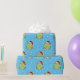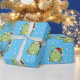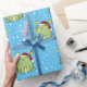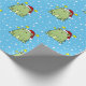 Sapo de Natal verde e bonito vestindo um chapéu de Papai Noel vermelho e branco sobre um fundo azul com muitos flocos de neve brancos.