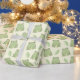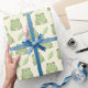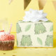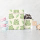 Muitas sapos verdes e folhas verdes num fundo amarelo pálido.