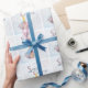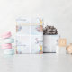 As lindas cores pastéis constituem este adorável papel de embrulho, que inclui as palavras "Seas and Saudações", que são enfeitadas com conchas e corais, e uma bonito vela de férias num fundo azul pálido.