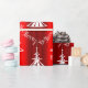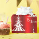 Este papel de embalagem de Natal vermelho e branco apresenta um padrão contemporâneo de árvores de Natal brancas, com as palavras "Seja Feliz" espalhadas sobre um fundo vermelho brilhante e metálico.