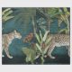 O papel de fundo azul de cor profunda rico é de grande dimensão e peso pesado para a desvinculação em móveis, armários ou para criar a arte de parede. O estilo Vintage Safari tem um Leopard perseguindo entre a selva da floresta tropical com flores vermelhas, palmeiras e bananeiras verde e design folhagem com escrita manual, cartas escritas à mão e efêmeras que foi desenhada graficamente por uma artista e designer internacionalmente licenciada, Audrey Jeanne Roberts, copyright.