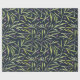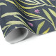 Padrão de trepadeiras verdes frondosas com pequenas flores rosa em um fundo azul escuro. O design é exuberante e orgânico, transmitindo uma sensação de tranquilidade e natureza.