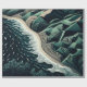 Serene Shores: This stunning top-down illustration captures the harmony of land and sea, featuring waves gently breaking on sandy beaches with lush green mountains in the background. Rendered in soothing shades of dark blue-green, the artwork evokes a sense of tranquility and balance. The intricate detail of the ocean’s patterns meeting the shore, paired with the trees lining the water’s edge, enhances the peaceful atmosphere. Created in a woodcut print style with simple lines and a flat design, the piece is reminiscent of hand-drawn animation, offering a timeless, serene depiction of nature’s beauty.