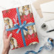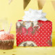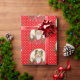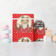 Este presente contém uma prateleira de cor d'água enfiada numa fatia de madeira cercada por vegetação natalícia. O fundo é um padrão polkadot vermelho e branco. Perfeito para o amante da estante na sua vida.