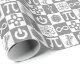 Este papel de envolvimento impressionante representa todo o geek das coisas. Inclui o símbolo da infinidade, almofada direcional do jogo de vídeo, símbolo de USB, átomo, bacon, símbolo do poder, 20 tomados partido morrem, e pi.
