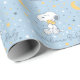 This delightful gift wrap features the sweet Snoopy character sitting and holding a star, set against a light blue background adorned with moons and stars, with the celebratory phrase "Welcome Baby" printed repeatedly throughout the pattern. This non-gender-specific text makes it a perfect, coordinating choice for wrapping baby shower gifts, general new baby presents, or items for a "Welcome Home" celebration for a newborn.
