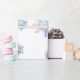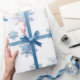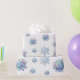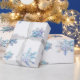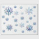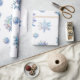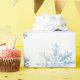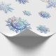 Um floco de neve detalhado com uma vibrante mistura de matizes azuis e rosados se destaca contra um fundo branco. Destacam-se os intrincados padrões, que lhe conferem uma aparência iluminada e quase tridimensional.