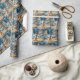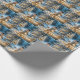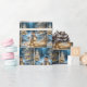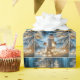 Um bonitão vestindo um cachecol e um chapéu em uma floresta nevada cercado por árvores iluminadas com luzes de Natal