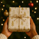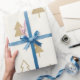 An ivory wrap featuring a seamless pattern of taupe trees, soft stars, and pinecones for a refined holiday look. Its warm neutral palette suits those who enjoy minimalist seasonal décor and want coordinated, nature-inspired accents for their Christmas packaging.