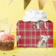 Uma ilustração adorável com aquarela de um cão de Staffordshire Terrier, é feita em pares com um fundo sazonal vermelho e branco, com padrão de xadrez, e o cão veste um chapéu festivo.