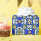 A stained glass style pattern of shades of blue and yellow decorates this gift wrap. AI-generated by IveyCottage.