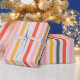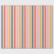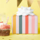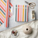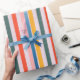 The paper features a large-scale, mid-century modern geometric pattern consisting of horizontal stripes. The design uses a coordinated mix of muted coral, sunny mustard yellow, and sage green set against a soft lavender or pale pink background. Perfect for birthdays, holidays, or everyday gifting, this design adds a joyful pop of color to any present—no extra embellishments needed.