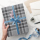 Papel de envolvimento cinzento do tartan com um teste padrão clássico da verificação do búfalo das cinzas e do branco. Aperfeiçoe para o envolvimento de presente de época natalícia do inverno!