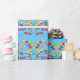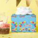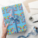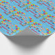 Diversão feliz papel de embrulho de aniversário em tema azul, crianças celebrando com balões, chapéus de festa, confete e lugar para o nome da criança! Veja outro tema correspondente na minha coleção!