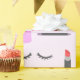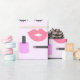 Um design bonito da composição, caracterizando o batom vermelho, os lábios, um lápis roxo do eyeliner, as pestanas falsas, e o verniz para as unhas do rosa.