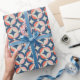 Características deste design moderno do meio século um teste padrão geométrico azul e coral.