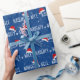 Texto branco NAUGHTY ou NICE com flocos de neve e bonés de Papai Noel em fundo azul. A cor de fundo pode ser alterada.
