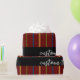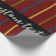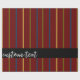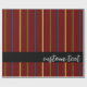 Elegante traço vertical de linhas em um grande marrom vermelho. As linhas listradas têm cor de ouro verde, azul e amarelo e um padrão repetitivo. Há texto personalizado em um estilo de script de cor clara, contra uma banda horizontal de cor preta.