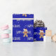 Texto branco FELIZ de FERIADOS com pão de gengibre e flocos de neve em um fundo azul brilhante. O texto pode ser editado. A cor de fundo pode ser alterada.