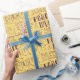 Este pacote de presente amarelo festivo está coberto por desejos de paz, amor e alegria em tipografia alegre e roxa.