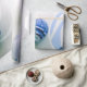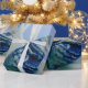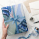 Um retrato interessante de três conchas marinhas em marinho com um fundo espiralado azul e branco sobre o tema. É apenas uma lembrança do oceano e dos seus maravilhosos tesouros.