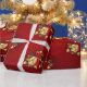 A composição de duas rosas vermelhas pintadas artisticamente e uma rosa ouro, decorada com ouro, folhas de joias sobre fundo texturizado.