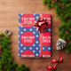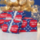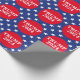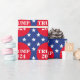 Este papel de embrulho patriótico apresenta a frase "Trump 2024" impressa em uma fonte branca e sofisticada sobre um fundo circular vermelho. A imagem é colocada sobre uma imagem de fundo maior de estrelas azul-escuras e brancas. O design de estrela azul e branca se assemelha ao padrão na bandeira americana.
