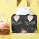 Trump's hairdo on a white balloon with a cartoon winking eye and smiling face on a black background, and scattered gold stars.