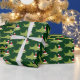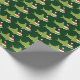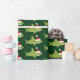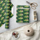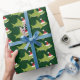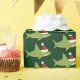 Papel de embrulho com tubarões bonitos, sorridentes, verdes, em Santa Hats em um fundo verde.
